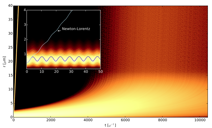 Below an electron initially at rest in a rotating em-field lying in the xy-plane is considered with a0=10000. The em-field has a Gaussian intensity distribution and is centered at the origin of the coordinate fame. As the electrons starts to move radiation friction confines it to the high intensity region of the external field. Equations of motion for the quiding center of the accelerating electron can be derived. Their solution is plotted as a red solid line in the plot below. Due to the guiding center dynamics the confinement time of the radiating electron is much prolonged. The black solid line shows the trajectory of the electron without radiation friction. In that case the electron leaves the high field region immediately.